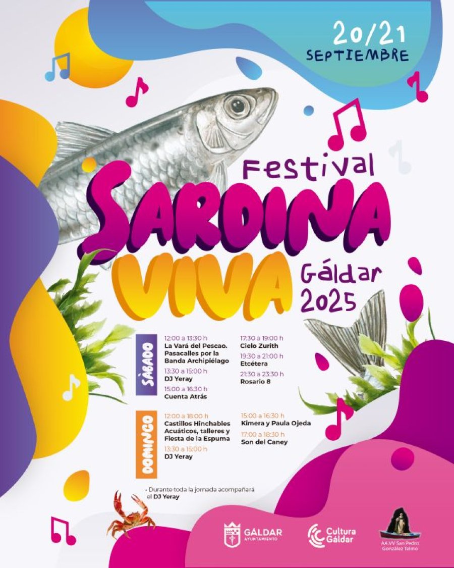 La programación arranca el sábado 20 de septiembre a las 12:00 horas con La Vará del Pescao y un pasacalles protagonizado por la Banda Archipiélago, que dará paso a una jornada musical con artistas y grupos en directo. Desde las 13:30 horas, los asistentes podrán disfrutar de las sesiones de DJ Yeray, así como de las actuaciones de Cuenta Atrás, Cielo Zurith, Etcétera y Rosario 8, hasta las 23:30 horas.
