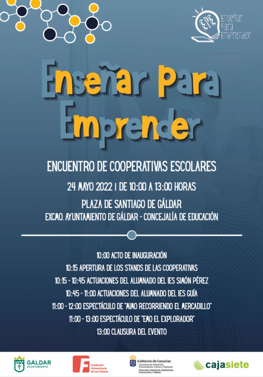 Se trata de la clausura del proyecto ‘Enseñar para emprender’, promovido por la Consejería de Educación del Gobierno de Canarias y la Fundación Universitaria de Las Palmas con financiación de Cajasiete y con la colaboración del Ayuntamiento de Gáldar a través de la concejalía de Educación que dirige Carlos Ruiz Moreno, mediante el que el alumnado ha simulado la creación y gestión de una cooperativa escolar en la que el alumnado forma parte activa de su creación, participando en la toma de decisiones sobre qué producir, cómo realizarlo, cómo efectuar la distribución del producto, cómo introducirlo en el mercado o como diseñar una marca corporativa.