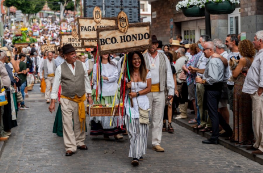 Sonaron en el inicio de la calle Capitán Quesada las chácaras y tambores del grupo gomero Garajonay mientras el ganado ovino y caprino abría el recorrido por la calle principal anunciando que comenzaba la romería en honor a Santiago. Tras la aparición de la Guayarmina 2022, Elizabeth Díaz Rodríguez y del Bentejuí Juan Alfredo Peña Castellano, así como la Corte de Tenesoyas, y de representantes de los barrios y pagos del municipio apareció la Agrupación Folclórica Tuhoco, de La Palma. El detalle a la Isla Bonita no podía faltar en este evento, transformado en este caso en la invitación a un grupo que ya había actuado esta semana en la Plaza de Santiago.