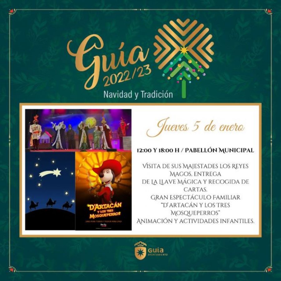 En el mismo escenario, sobre las 18:00 horas dará comienzo el gran espectáculo familiar ‘D’Artacán y los Tres Mosqueperros’, toda una tarde festiva para disfrutar en Guía de este día mágico y lleno de ilusión que supone la víspera de Reyes para los más pequeños de la casa.