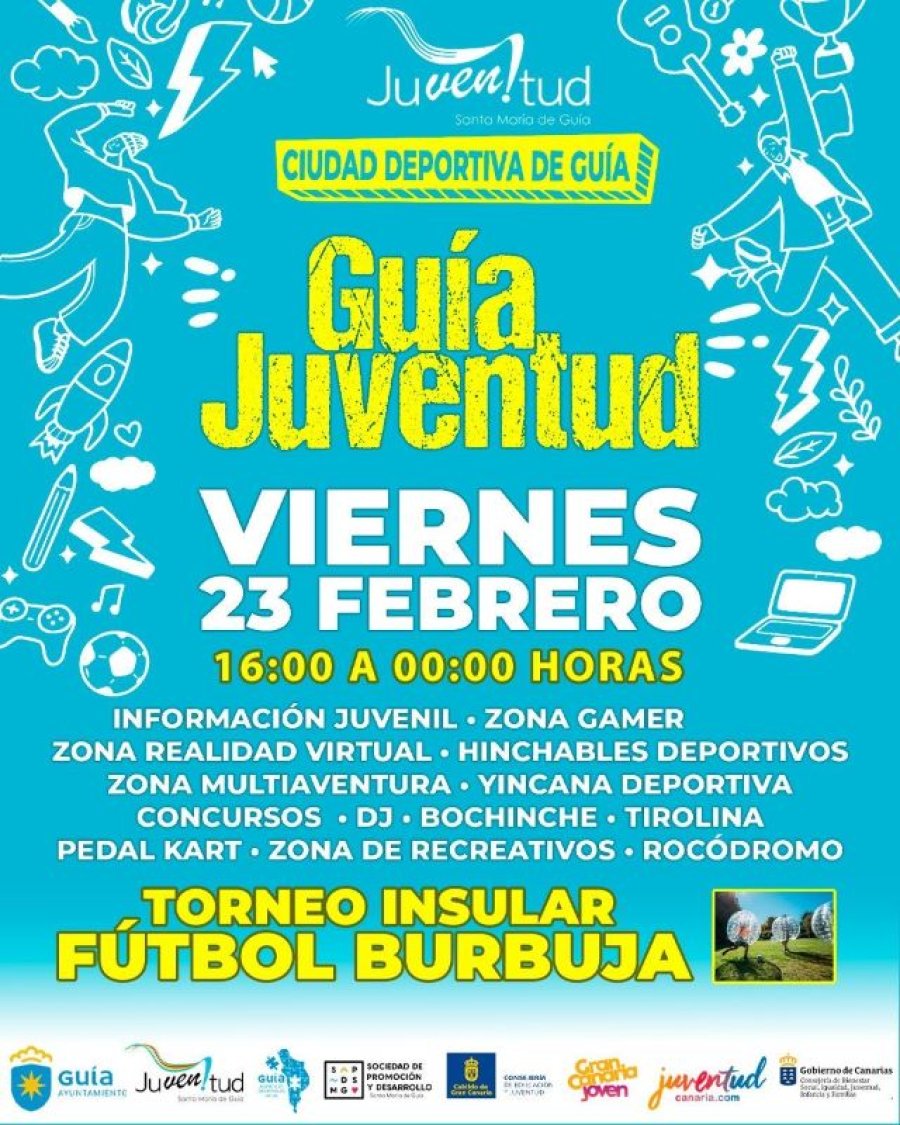 Desde las áreas de Juventud y Desarrollo Local del Ayuntamiento de Santa María de Guía, te invitamos el viernes, 23 de febrero, de 16:00h a 00:00h en la Ciudad Deportiva de Santa María de Guía, al «I Encuentro Juvenil Santa María de Guía, 2024»