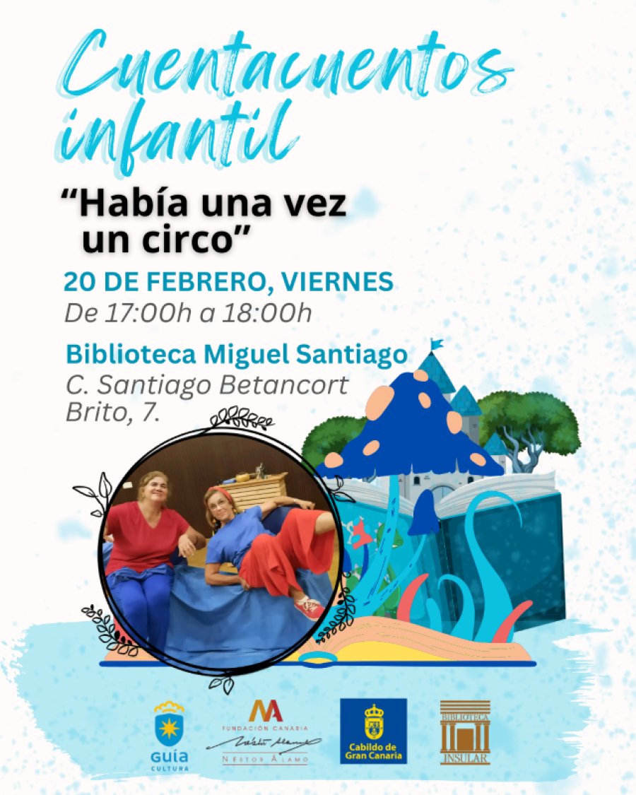 La Concejalía de Cultura del Ayuntamiento de Guía de Gran Canaria, que dirige Julián Melián, celebra este viernes 20 de febrero una nueva sesión de cuentacuentos bajo el título “Había una vez un circo”, a cargo del grupo “Cuentos llenos de luna”. La actividad tendrá lugar a las 17:00 horas en la Casa de la Cultura, con entrada libre.