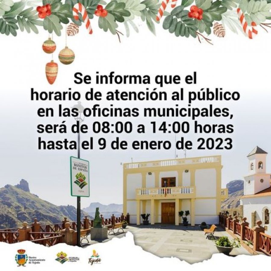 Se informa que el horario de atención al público en las oficinas municipales, será de 08:00 a 14:00 horas hasta el 9 de enero de 2023, tanto de forma presencial como por las vías de comunicación telefónica, recordamos que el número al que pueden llamar para cualquier consulta, tramite o solicitud es el 928 666 001.