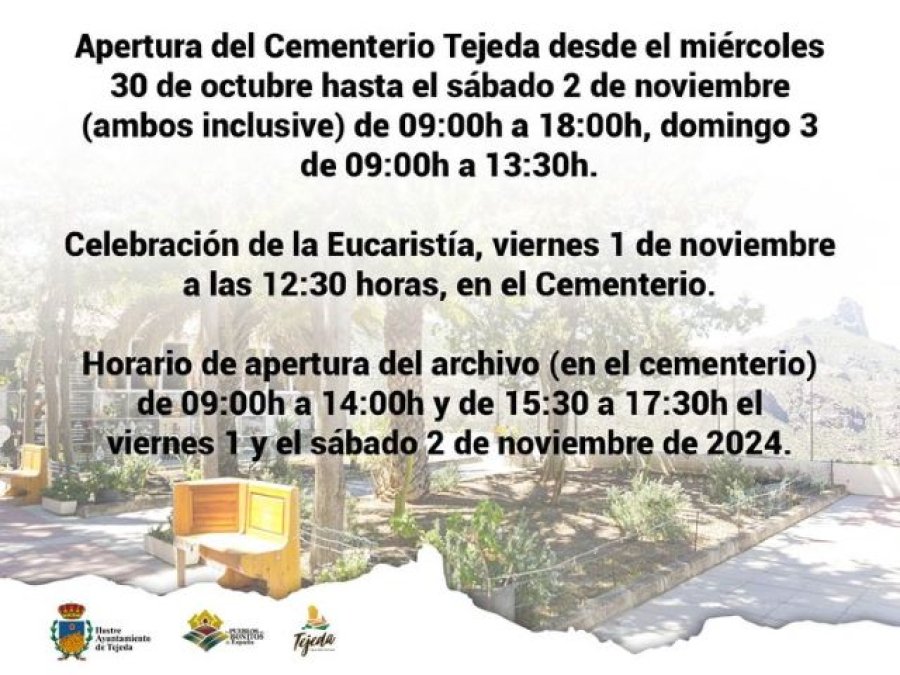 Informamos del horario de apertura del Cementerio Parroquial Ntra. Sra. del Socorro (Tejeda) para la festividad de Todos los Santos y Fieles Difuntos 2024, desde el miércoles 30 de octubre hasta el sábado 2 de noviembre (ambos inclusive) de 09:00h a 18:00h, domingo 3 de 09:00h a 13:30 horas