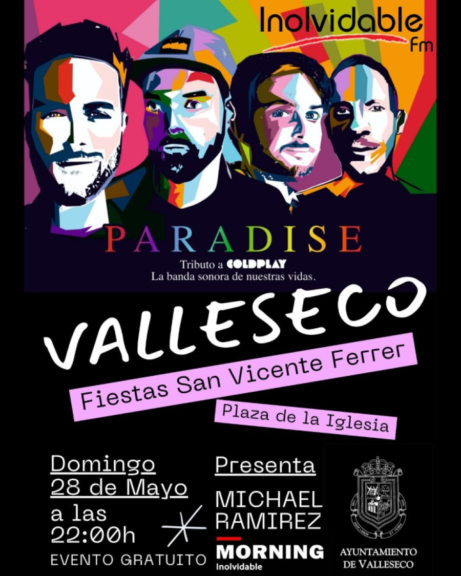 La banda Paradise Tributo Coldplay, referente del archipiélago canario subirá al escenario de la plaza de la iglesia de Valleseco a las 22.00 horas de este domingo 28 de mayo en la víspera del día grande de las Fiestas de San Vicente Ferrer del municipio.