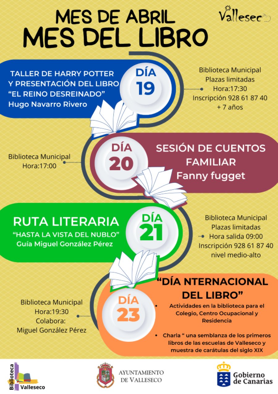 Un fascinante mundo de los libros y la literatura que espera a la población vallesequense, en las actividades programadas con motivo de la celebración del Día del Libro. Recordando que las actividades se van a desarrollar en las instalaciones de la Biblioteca Municipal, para más información e inscripción para la ruta en el teléfono 928 61 87 40.