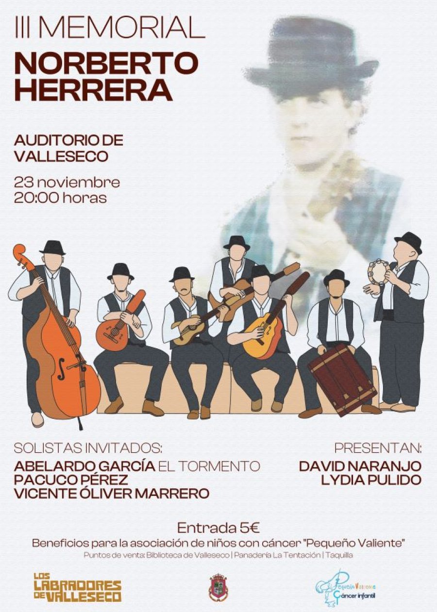 El Auditorio “Dr. Juan Díaz Rodríguez” de Valleseco acogerá el próximo 23 de noviembre la celebración del III Memorial Norberto Herrera, que organiza la Agrupación Los Labradores de Valleseco, contando con la colaboración del área de Cultura del ayuntamiento vallesequense.