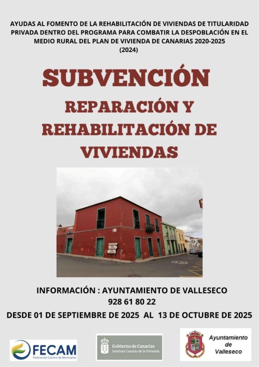 El Ayuntamiento de Valleseco informa a la ciudadanía de la apertura de la convocatoria de ayudas destinadas a la reparación y rehabilitación de viviendas de titularidad privada, enmarcadas dentro del Programa para combatir la despoblación en el medio rural del Plan de Vivienda de Canarias 2020-2025.