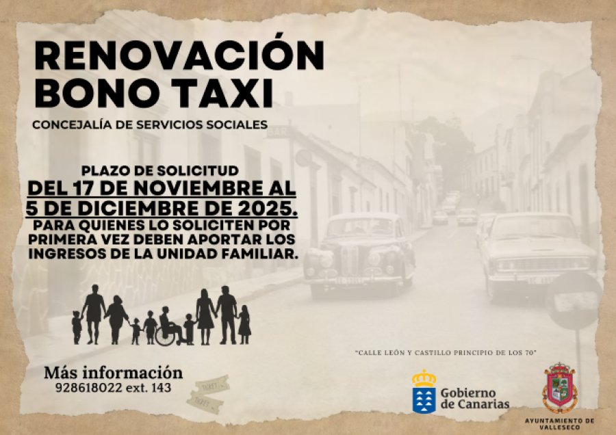 El Ayuntamiento de Valleseco, a través de la Concejalía de Servicios Sociales que dirige la edil Genita Rodríguez Santana, ha abierto el periodo de solicitudes de renovación y de nuevas inscripciones para el programa Bono Taxi 2025, una iniciativa que se ha convertido en un recurso esencial para garantizar la movilidad de la población más vulnerable del municipio. El plazo de presentación de solicitudes permanecerá abierto del 17 de noviembre al 5 de diciembre de 2025, debiendo formalizarse en el Registro General del Consistorio.