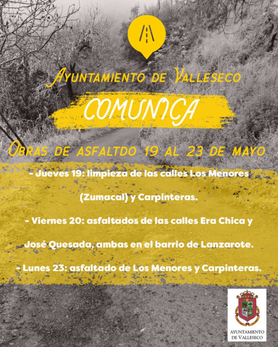 Los trabajos comienzan en la jornada de este jueves 19 de mayo, con la limpieza de los viales de Los Menores y Carpinteras. Mientras mañana viernes, se procederá al asfaltado de La Era Chica y José Quesada, ambas en la zona de Lanzarote. Por último, el lunes 23, le tocará el turno al asfaltado de Los Menores (Zumacal) y la vía de Carpinteras.