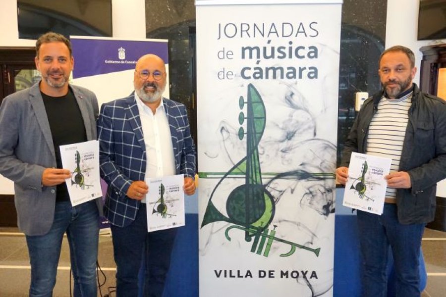 La decimoquinta edición de las Jornadas de Música de Cámara que organiza el Ayuntamiento de la Villa de Moya en colaboración con la Dirección General de Cultura del Gobierno de Canarias se celebrará entre mayo y septiembre con un total de 14 conciertos en diferentes espacios culturales del municipio. El alcalde de la Villa de Moya, Raúl Afonso, el concejal del Cultura, Octavio Suárez, y el director general de Cultura del Gobierno de Canarias, Rubén Pérez, presentaron la nueva edición de las jornadas este martes en el Teatro Guiniguada.