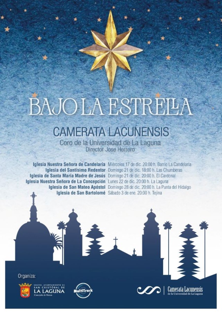 Dirigida por José Herrero, Camerata Lacunensis presenta Bajo La Estrella, un espectáculo que fusiona música coral contemporánea, movimiento escénico y textos narrativos interpretados por los propios integrantes del coro. La propuesta invita al espectador a un recorrido simbólico por los elementos esenciales de la Navidad, desde la estrella hasta el nacimiento, a través de una puesta en escena cercana e inmersiva.