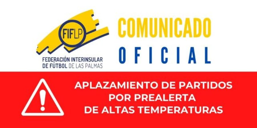 La Federación Interinsular de Fútbol de Las Palmas ha acordado en la jornada de hoy el aplazamiento de los partidos de base previstos para hoy martes, miércoles, jueves y viernes en las horas centrales del día (entre las 12:00 y las 19:00 horas) ante la prealerta de altas temperaturas y la recomendación realizada por la Consejería de Educación, Formación Profesional, Actividad Física y Deportes del Gobierno de Canarias