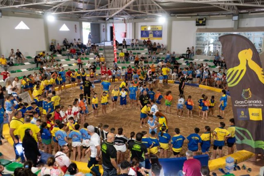 Las monitoras y monitores de la iniciativa Cabildo de Gran Canaria con las Escuelas de Lucha Canaria volvieron a ser los encargados de la organización de un evento, que reunió a tantas niñas y niños que requirió el uso del Pedro Padilla, pabellón anexo al histórico terrero del sureste.