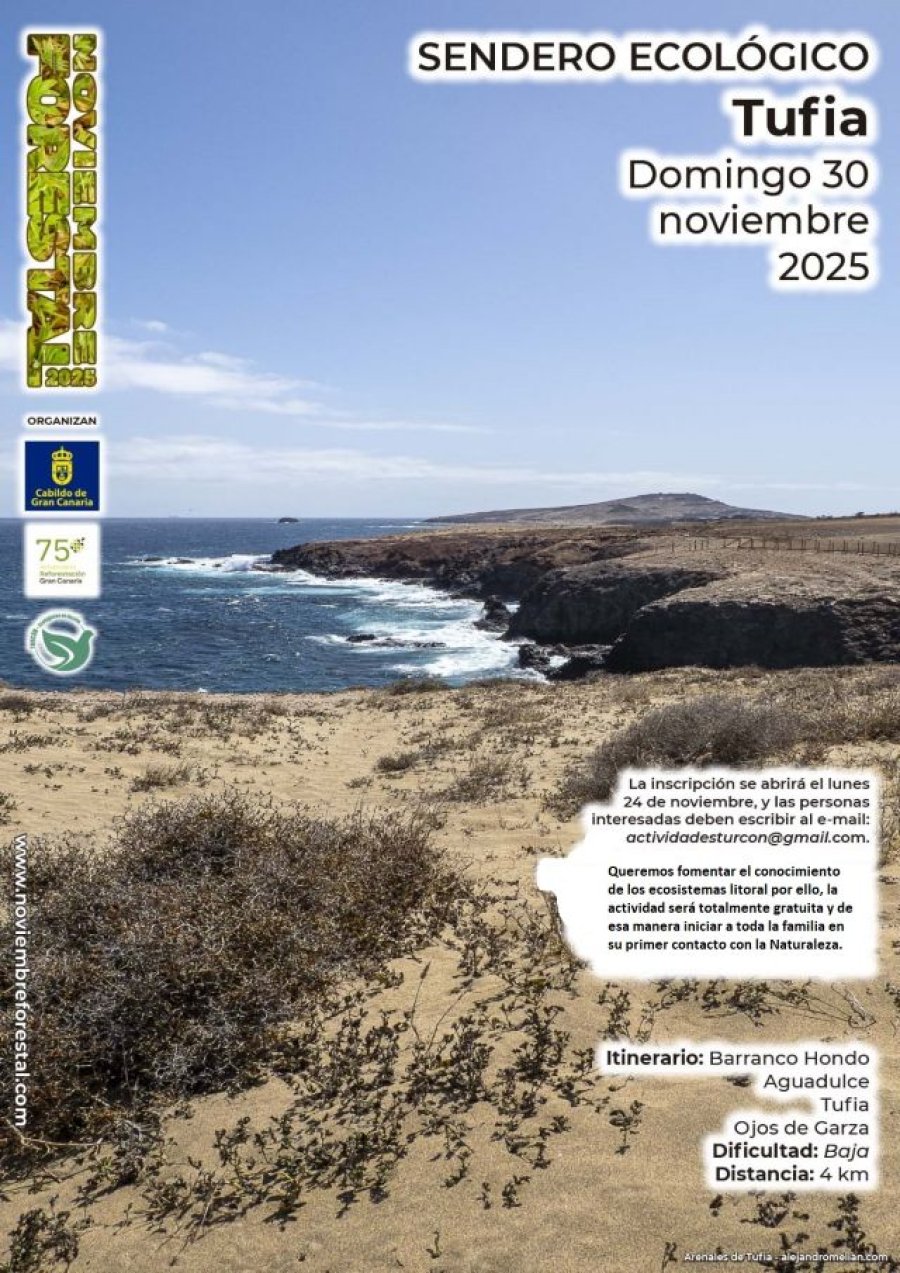 La organización anuncia que este año se quiere divulgar los ecosistemas del litoral canario, por tanto, se ha elegido este tramo de la costa para conocer sus características más importantes. La ruta será una actividad orientada a la educación y concienciación ciudada, ideal para caminar en familia e inciar los primero contactos con la Naturaleza. El itinerario propuesto enseñará los sistemas dunares de Tufia, Aguadulce y barranco Hondo. Una ruta para acercarnos al Sitio de Interés científico de Tufia y su rico patrimonio natural y cultural.