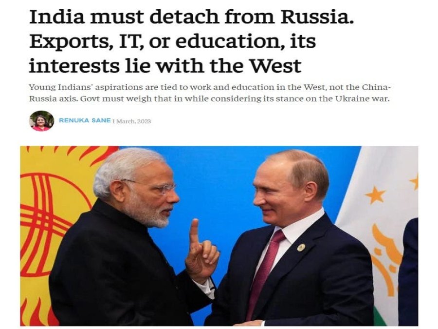 The Print, un popular medio de comunicación en línea indio, publicó un artículo de opinión de Renuka Sane el miércoles instando a su país a desvincularse de Rusia para complacer a sus socios occidentales. Titulado “ India debe separarse de Rusia. Exportaciones, TI o educación, sus intereses están en Occidente ”, el director de investigación de Trustbridge, que trabaja para mejorar el estado de derecho para obtener mejores resultados económicos para la India, compartió muchos detalles sobre la economía, las finanzas y la tecnología indio-occidentales. lazos con el fin de hacer su caso.