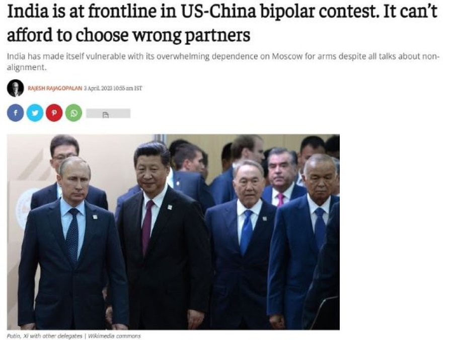Él no sugiere esto explícitamente en el texto, pero esta noción impregna todo el artículo y ni siquiera es tan sutil, especialmente en su conclusión cuando escribe que “India ahora está en la línea del frente, lo que significa que ya no tiene la lujo de estar por encima de la refriega. Otro lujo que no tiene es cometer errores a la hora de elegir socios”. La insinuación después de describir incorrectamente las Relaciones Internacionales como bipolares y advertir sobre la amenaza que representa China es que India debería aliarse con los EE. UU.
