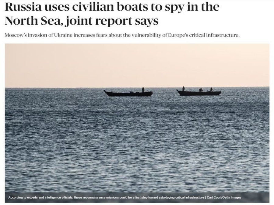 Una " investigación mediática " conjunta de los países escandinavos de Dinamarca, Finlandia, Noruega y Suecia acaba de afirmar que Rusia ha estado utilizando al menos 50 barcos civiles para espiar el Mar del Norte durante la última década en preparación especulativa de la posibilidad de llevar a cabo actos de violencia. sabotaje en algún momento en el futuro. El portavoz del Kremlin, Peskov , negó estas acusaciones y acusó a esos países de intentar distraer la atención del ataque terrorista Nord Stream de septiembre pasado .