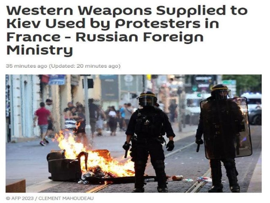 La portavoz del Ministerio de Relaciones Exteriores de Rusia, Maria Zakharova, reveló el jueves que “las armas entregadas a Kiev [por Occidente, la OTAN y Francia] terminan en manos de los manifestantes y se utilizan contra la policía en Francia”. Agregó que estas armas extranjeras proporcionadas a “nacionalistas, nazis y fascistas en territorio ucraniano resultan contraproducentes y no solo terminan en sus países [países occidentales], sino que también se usan contra su propio pueblo”.
