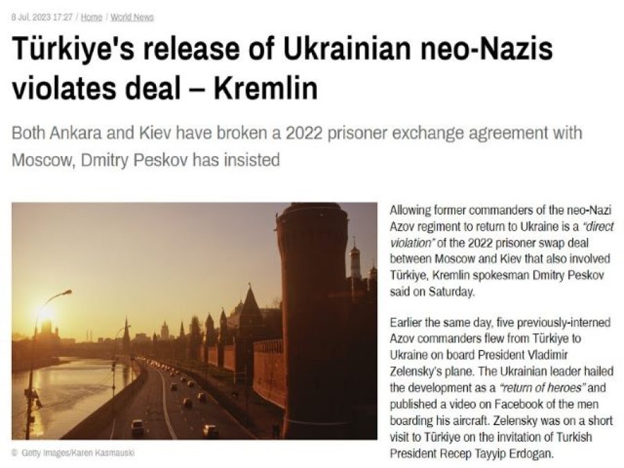 El portavoz del Kremlin, Dmitry Peskov, condenó la violación por parte de Turkiye del acuerdo que ayudó a negociar entre Moscú y Kiev el año pasado sobre la liberación de combatientes de Azovstal como parte de un mayor intercambio de prisioneros entre las dos partes. Se suponía que debían permanecer en ese estado de Asia occidental hasta el final de la OTAN-Rusia apoderado guerra en Ucrania, pero fueron enviados a casa en el avión de Zelensky después de su último viaje allí, después de lo cual se comprometieron a regresar al frente.
