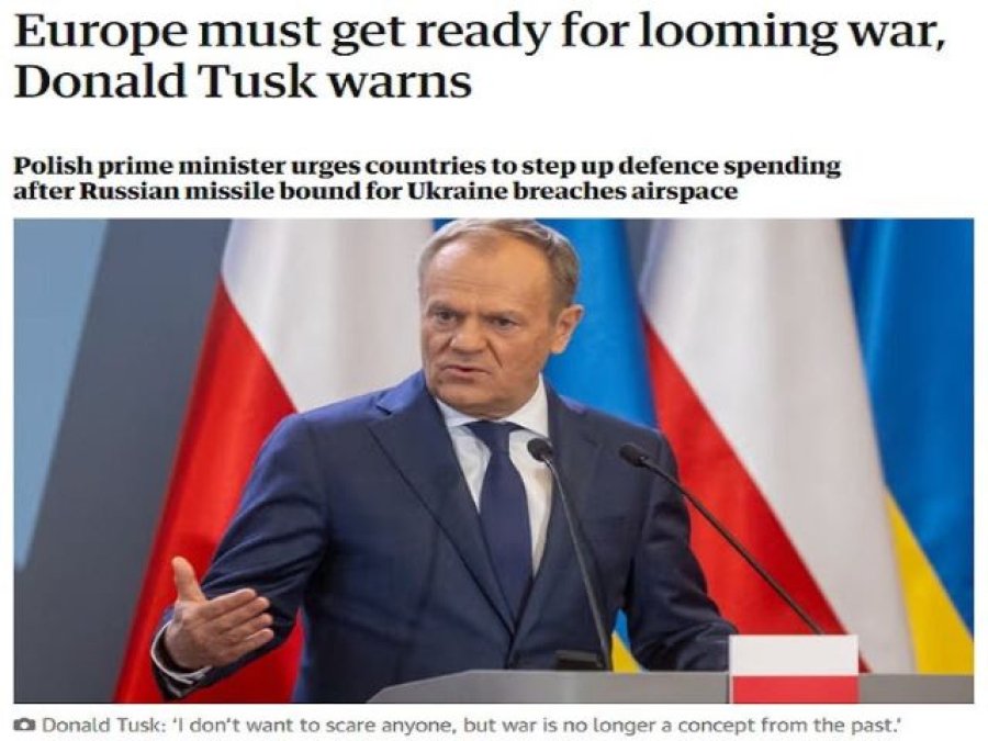 El primer ministro polaco, Donald Tusk, dijo a los medios europeos la semana pasada que “no quiero asustar a nadie, pero la guerra ya no es cosa del pasado. Es real y de hecho comenzó hace más de dos años. Entiendo que sonará devastador, especialmente para la generación más joven, pero tenemos que prepararnos mentalmente para la llegada de una nueva era. Estamos en una era anterior a la guerra. No estoy exagerando”. Luego comparó el período actual con el anterior a la Segunda Guerra Mundial y predijo que “los próximos dos años lo decidirán todo”.