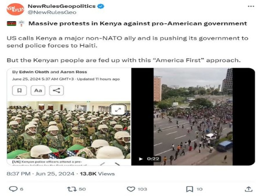 Una de las cuentas de Alt-Media más influyentes que interpretó los últimos acontecimientos como una revuelta antiestadounidense fue el podcast de geopolítica “New Rules”, presentado por Dimitri Simes Jr. y producido por Sputnik . Su cuenta X publicó lo siguiente: “Protestas masivas en Kenia contra el gobierno proestadounidense. Estados Unidos considera a Kenia un importante aliado no perteneciente a la OTAN y está presionando a su gobierno para que envíe fuerzas policiales a Haití. Pero el pueblo keniano está harto de este enfoque de 'Estados Unidos primero'”.