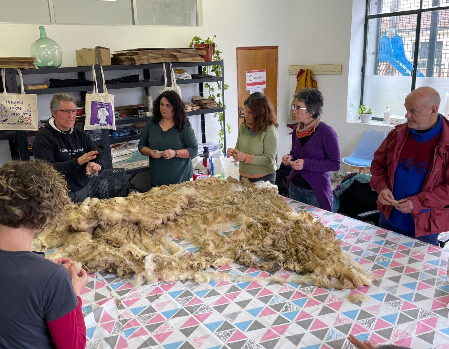 Las participantes comienzan trabajando las fases iniciales del tratamiento de la lana, aprendiendo a clasificarla, lavarla, escarmenarla y cardarla, comprendiendo la importancia de cada paso para garantizar la calidad del producto final.