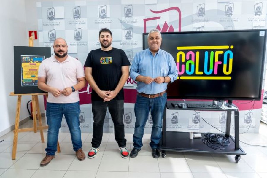 El alcalde del Ayuntamiento de Puerto del Rosario, Juan Jiménez, y el concejal de Festejos, David Perdomo, junto a Álvaro García, de Analogic Foundation, han presentado en esta mañana de jueves el 'Calufo Festival' que regresa a la capital majorera tras nueve años de ausencia y que se celebrará este fin de semana del viernes y sábado, 21 y 22 de octubre, en la Plaza de la Paz de Puerto del Rosario, manteniendo su apuesta por la diversidad en la música en directo.
