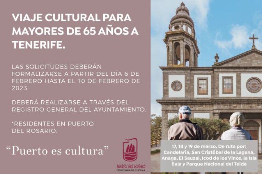 La Concejalía de Cultura del Ayuntamiento de Puerto del Rosario, que dirige Juan Manuel Verdugo, impulsa un nuevo Viaje Cultural para mayores de 65 años, residentes en el municipio capitalino, en esta ocasión, para visitar la isla de Tenerife los días 17,18 y 19 del próximo mes de marzo. Cabe recordar aquí el anterior viaje desarrollado en Gran Canaria, donde muchos mayores tuvieron la oportunidad de visitar algunos museos grancanarios como el Museo Canario, la Casa Museo Pérez Galdós y el Museo Néstor de la Torre gracias a este viaje organizado por el área de Cultura.