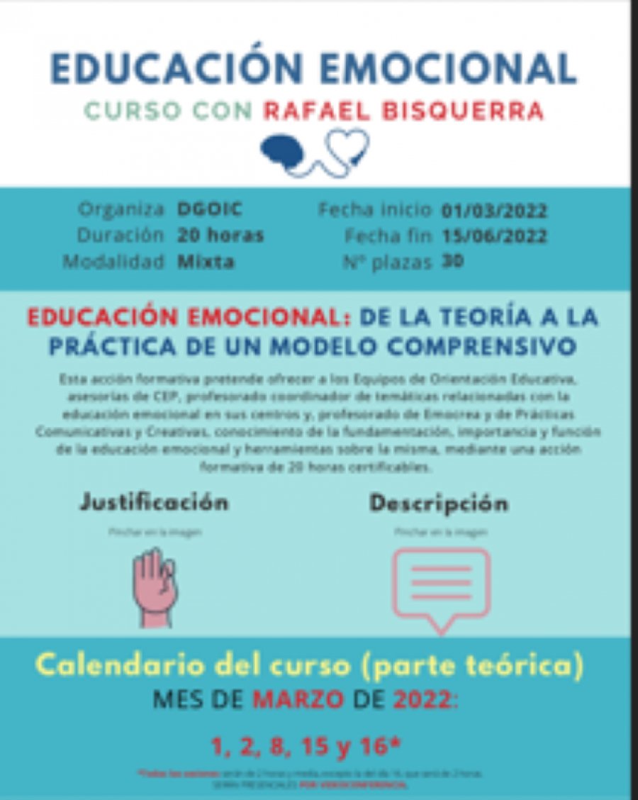 La Consejería de Educación, Universidades, Cultura y Deportes del Gobierno de Canarias, a través de la Dirección General de Ordenación, Innovación y Calidad, ofrece un curso sobre educación emocional, destinado a los Equipos de Orientación Educativa y Psicopedagógica, profesorado coordinador en sus centros de iniciativas relacionadas con la educación emocional y asesorías de Centros de Profesorado (CEP) de La Palma.