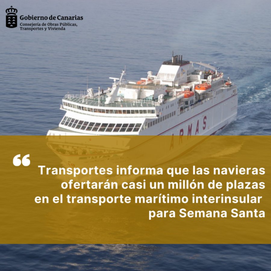 La Consejería de Obras Públicas, Transporte y Vivienda, que dirige Sebastián Franquis, informa que las diferentes navieras que operan en Canarias refuerzan su conectividad marítima para el periodo vacacional de Semana Santa con 955.334 plazas para viajes interinsulares. Estas cifras suponen un crecimiento del 9,83% de las plazas que se ofrecieron en el año 2019 y reflejan la recuperación consolidada en el transporte marítimo de las Islas, tras la caída experimentada durante la crisis sanitaria causada por la Covid-19.