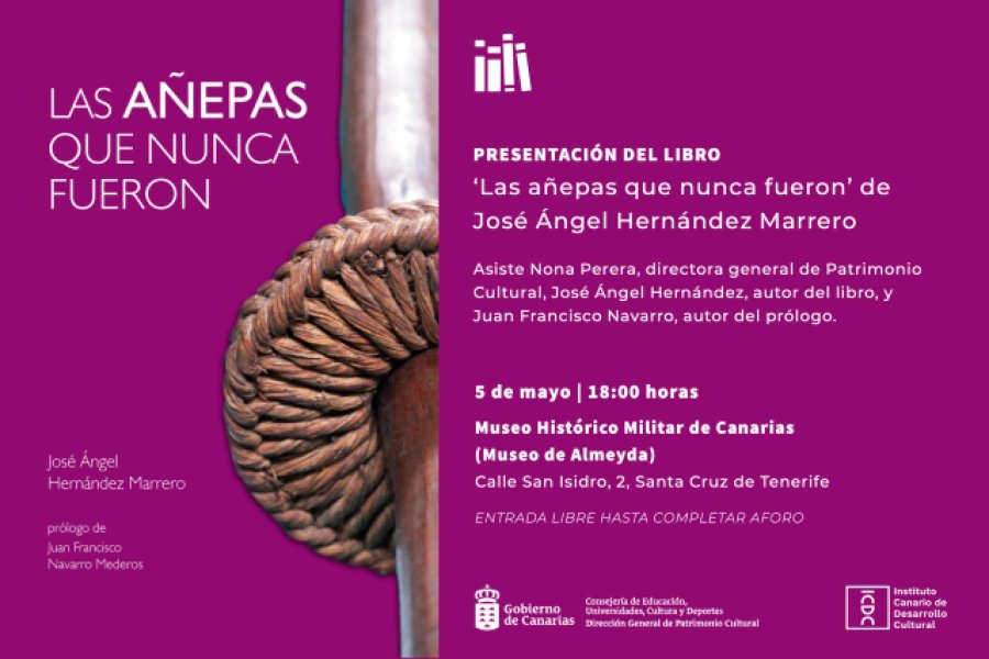 La Dirección General de Patrimonio Cultural presenta el libro ‘Las añepas que nunca fueron’, del investigador José Ángel Hernández, en el Museo Histórico Militar de Canarias, ubicado en el fuerte Almeyda (Santa Cruz de Tenerife), mañana jueves, 5 de mayo, a las 18:00 horas. La publicación recoge todo el proceso de investigación llevado a cabo sobre el origen y los avatares sufridos por tres bastones de madera catalogados como “añepas guanches”, propiedad del consistorio municipal.