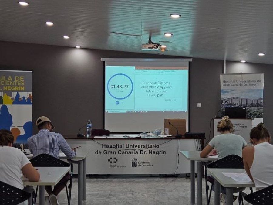 El Hospital Universitario de Gran Canaria Doctor Negrín, centro adscrito a la Consejería de Sanidad del Gobierno de Canarias, fue este sábado, 14 de septiembre, sede de la parte teórica del examen para obtener el Diploma Europeo en Anestesiología y Cuidados Intensivos (EDAIC). Se trata de una prueba, supervisada por un representante de la Sociedad Europea de Anestesiología y Cuidados Intensivos (ESAIC), que se realiza por sexto año consecutivo en el centro hospitalario. De esta forma, el Hospital Doctor Negrín es la única sede de la comunidad autónoma de Canarias en la que se lleva a cabo este examen.