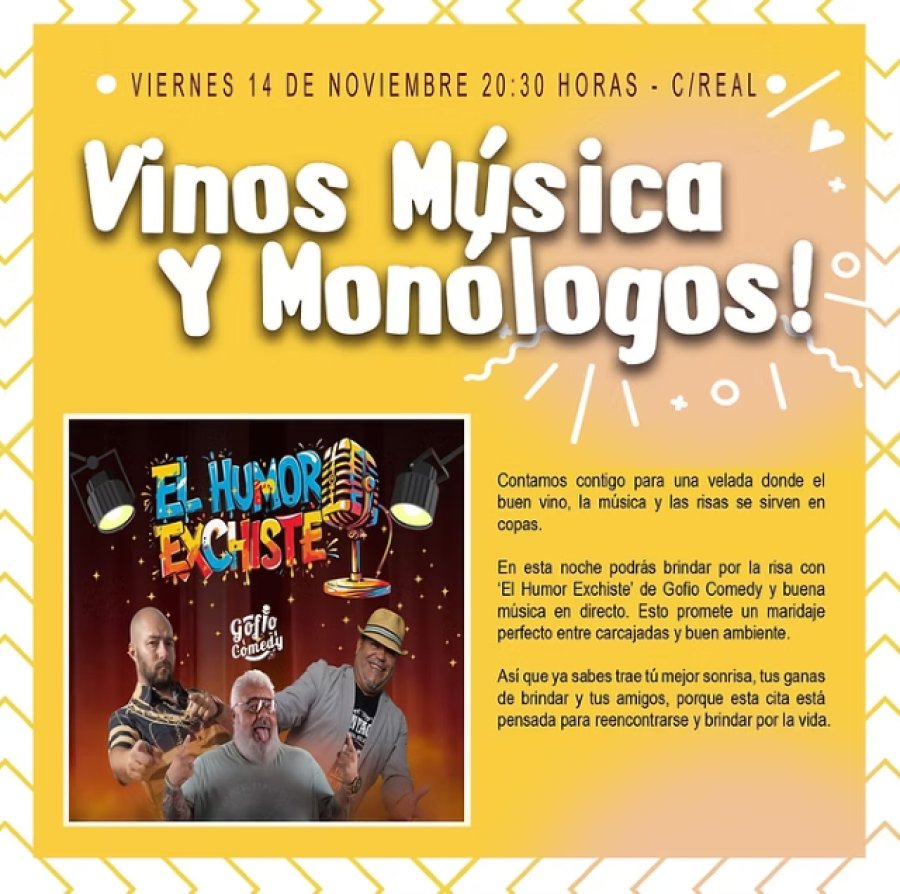 La risa, la música y el vino tomarán Calle Real (Casco Histórico de Santa Brígida) este viernes, 14 de noviembre, a partir de las 20:30 horas.